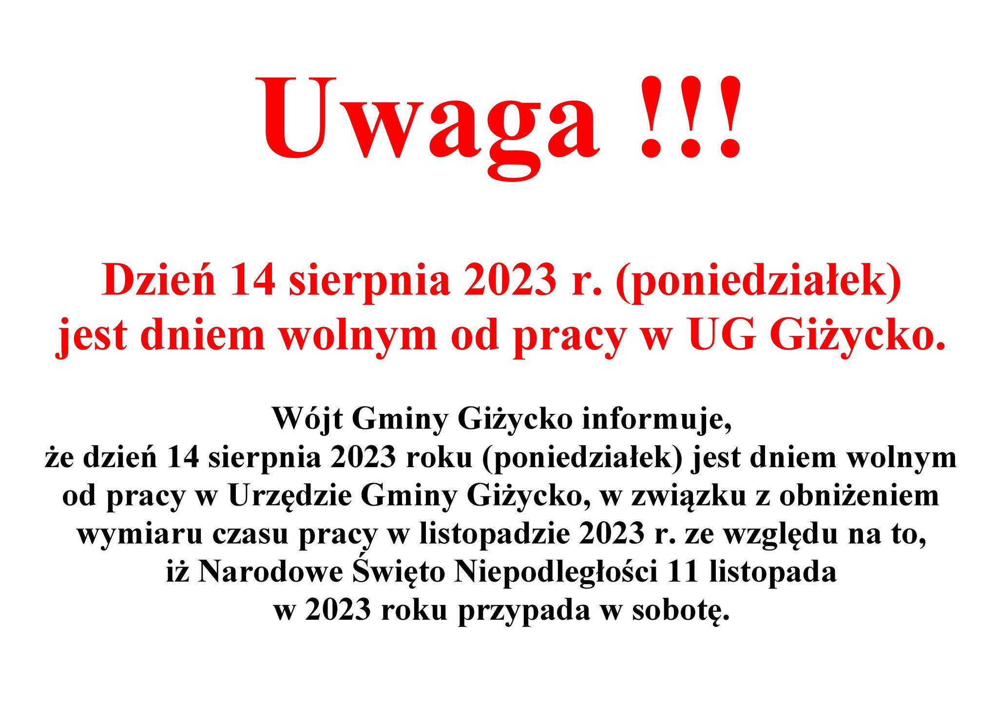 Wójt Gminy Giżycko informuje, że dzień 14 sierpnia 2023 roku (poniedziałek) jest dniem wolnym od pracy w Urzędzie Gminy Giżycko, w związku z obniżeniem wymiaru czasu pracy w listopadzie 2023 r. ze względu na to, iż Narodowe Święto Niepodległości 11 listopada w 2023 roku przypada w sobotę.