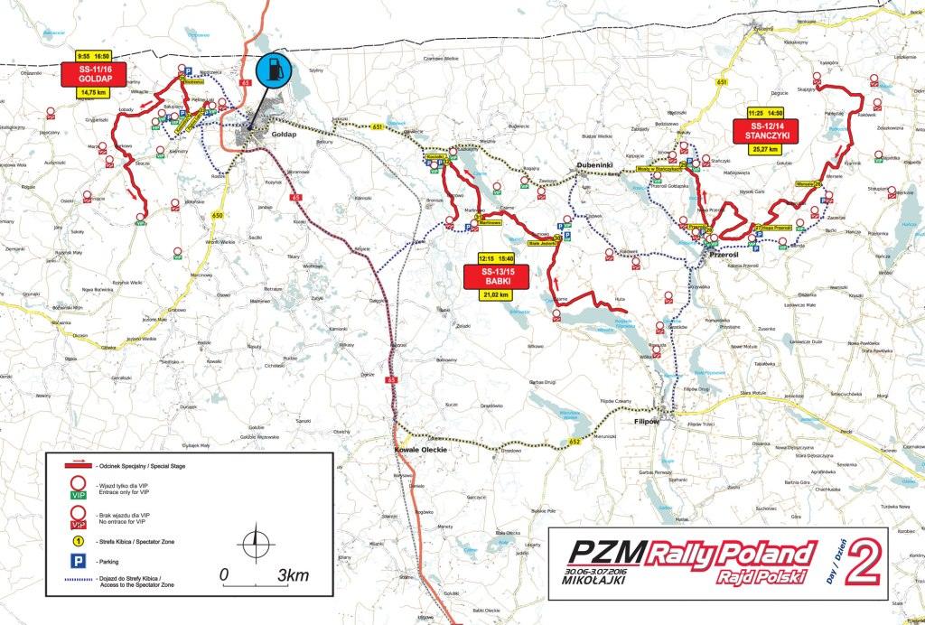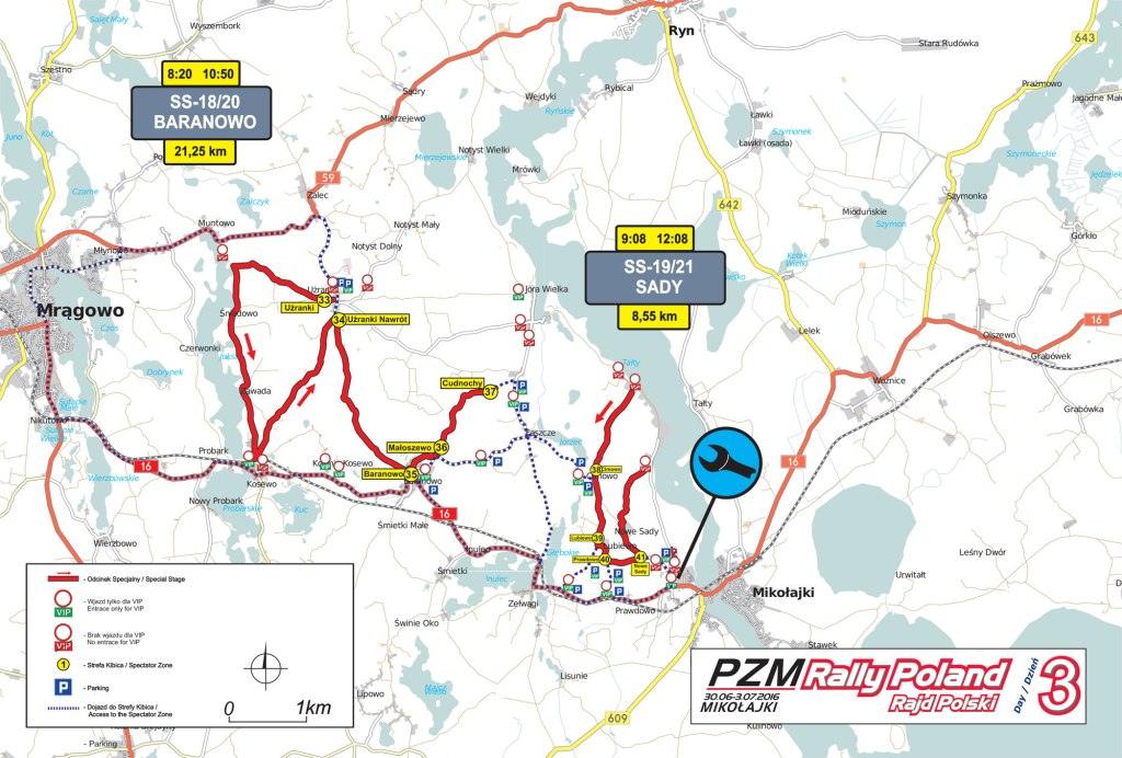 Niedziela to po dwa przejazdy oesów Baranowo i Sady. Ostatni z odcinków będzie jednocześnie tzw. Power Stagem, na którym trzy pierwsze miejsca premiowane są dodatkowymi punktami (3, 2, 1). Na mecie tej próby poznamy zwycięzcę rajdu, ale uroczyste zakończenie i koronacja triumfatorów PZM Rajdu Polski o godzinie 14 w Mikołajkach.