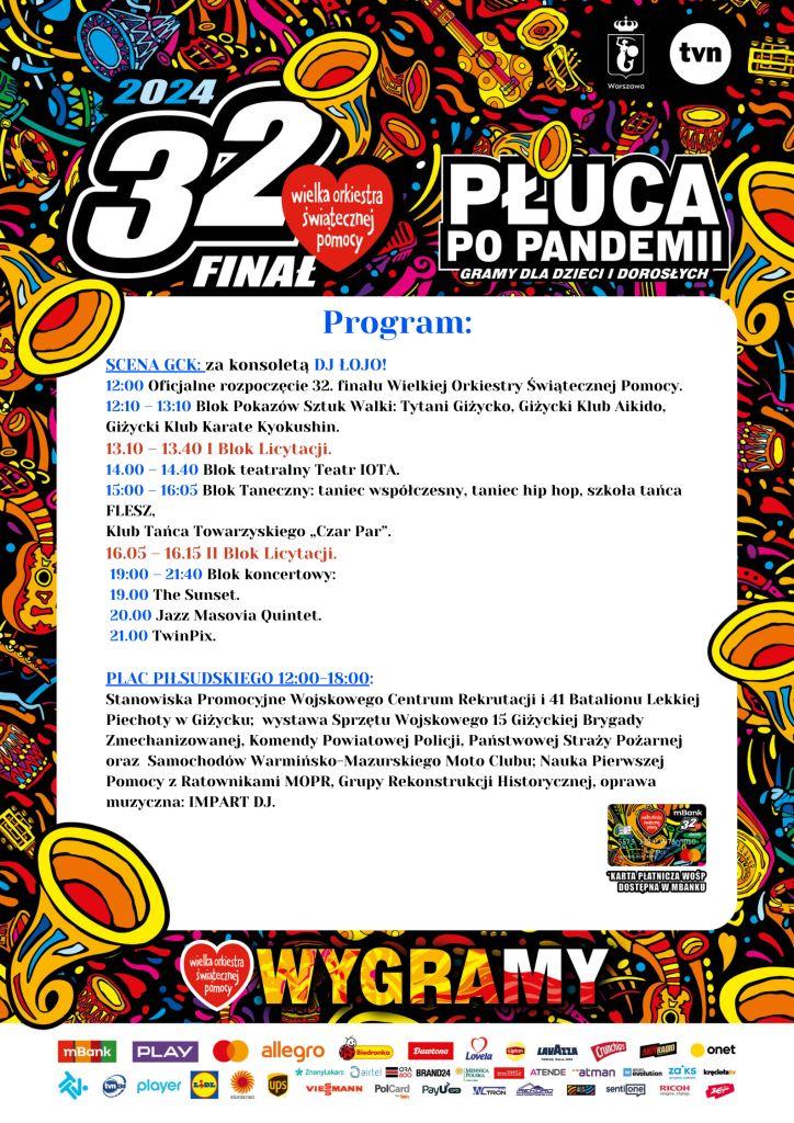 Początek o godzinie 12:00 w trzech punktach Giżycka – budynek Giżyckiego Centrum Kultury, gdzie nastąpi oficjalne otwarcie 32. finału, licytacje, pokazy sztuk walki, pokazy taneczne, teatr i koncerty!