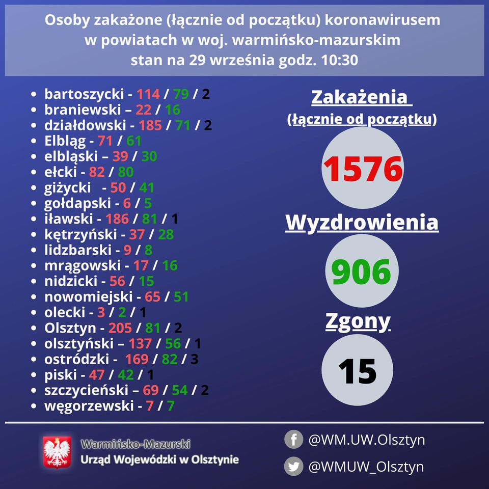 Na Warmii i Mazurach odnotowano dotąd 1 576 zakażeń koronawirusem.