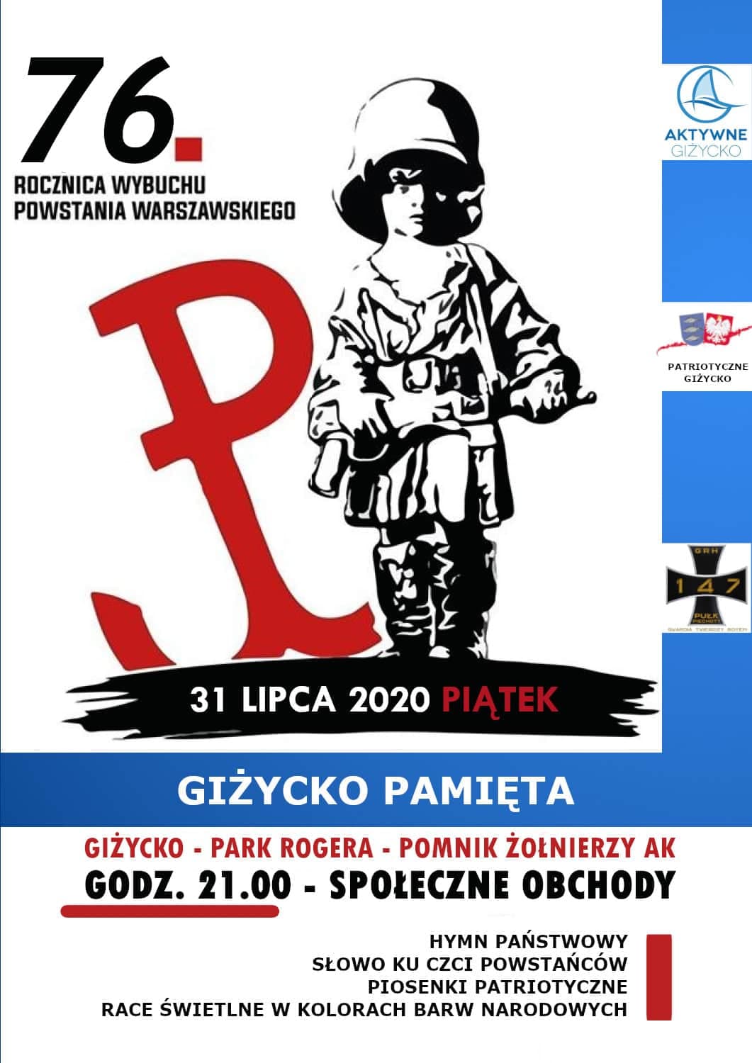 76. rocznica Powstania Warszawskiego. Społeczne obchody w Giżycku 26 lipca 20200Stowarzyszenie Aktywne Giżycko, Patriotyczne Giżycko i 147 Pułk Piechoty zapraszają na społeczne obchody 76. rocznicy Powstania Warszawskiego. Szczegóły na plakacie poniżej.