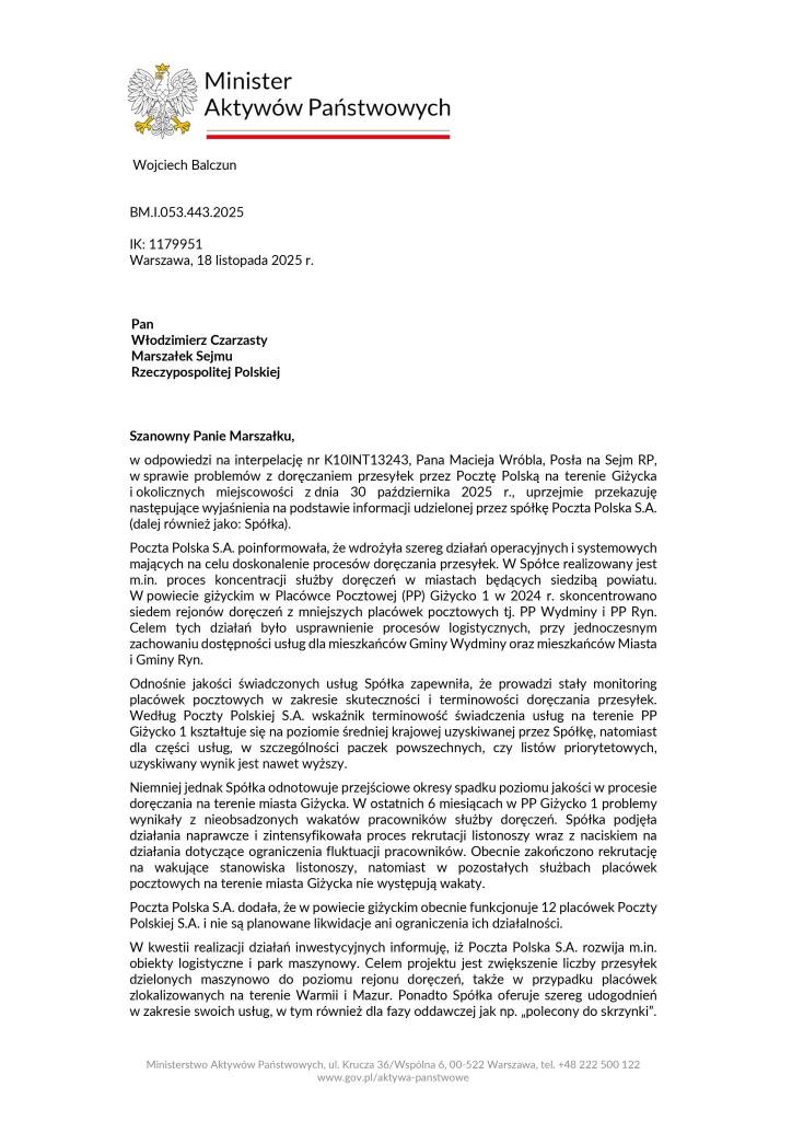 W ostatnich tygodniach docierały do mnie liczne sygnały dotyczące problemów z funkcjonowaniem Poczty Polskiej w Giżycku i okolicznych miejscowościach. Opóźnienia w doręczeniach, brak listonoszy i uciążliwości dla mieszkańców całego powiatu. W tej sprawie zwróciłem się do parlamentarzystów z regionu o interwencję.