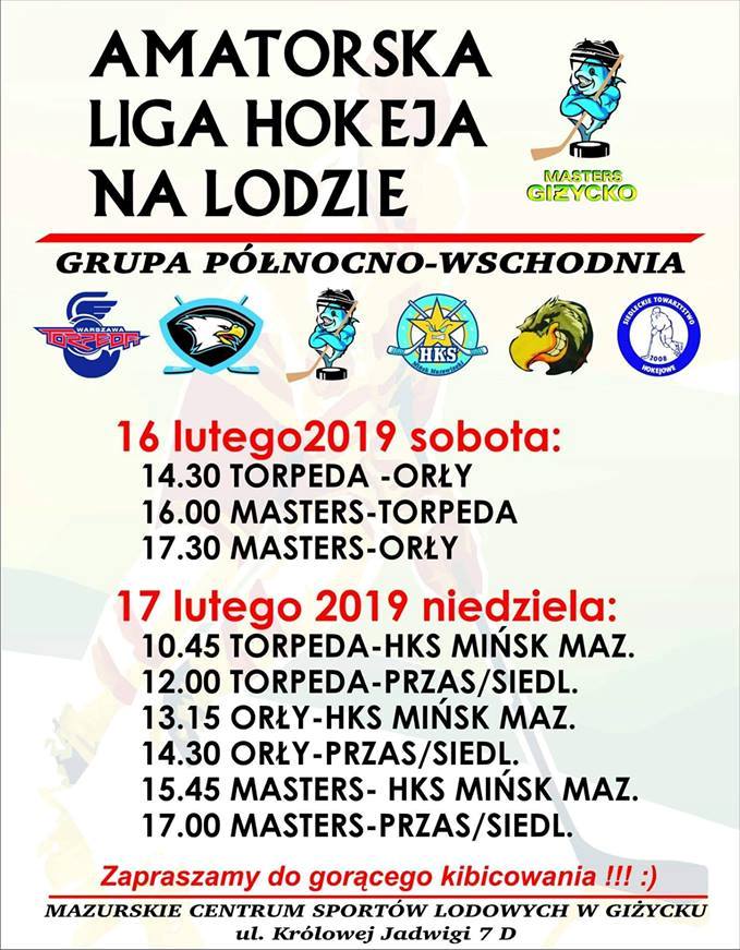 Amatorska Liga Hokeja na Lodzie 14 lutego 20190Już w najbliższy weekend w Mazurskim Centrum Lodowym rozpocznie zmagania Amatorska Ligi Hokeja na Lodzie. Wstęp wolny. Szczegóły na plakacie poniżej.