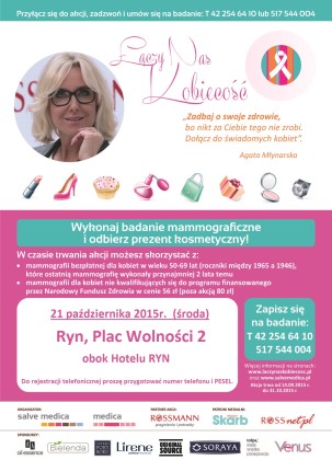 W dniu 21 października 2015r. ( środa ) obok Hotelu Ryn, Plac Wolności 2 odbędą się bezpłatne badania mammograficzne dla kobiet w wieku 50 – 69 lat.