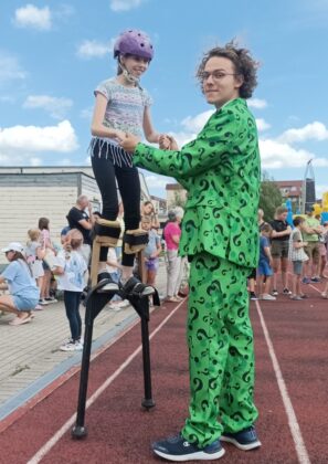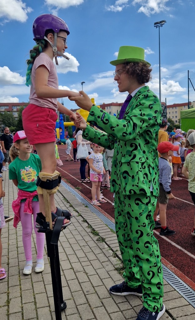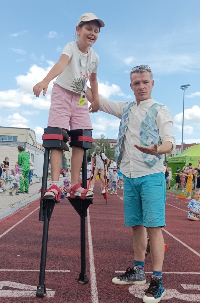 W ten bajkowy czwartek gościliśmy szczudlarzy, którzy świetnie bawili się z dziećmi, pokazując swoje umiejętności, zadziwiając kolorowymi strojami. Zabawa z wysokimi ludźmi wywołała wśród dzieci duże emocje i radość. Doświadczeni animatorzy prowadzili różne konkursy, warsztaty, pokazy artystyczne, były wielkie bańki mydlane i każdy mógł spróbować poruszania się na szczudłach.