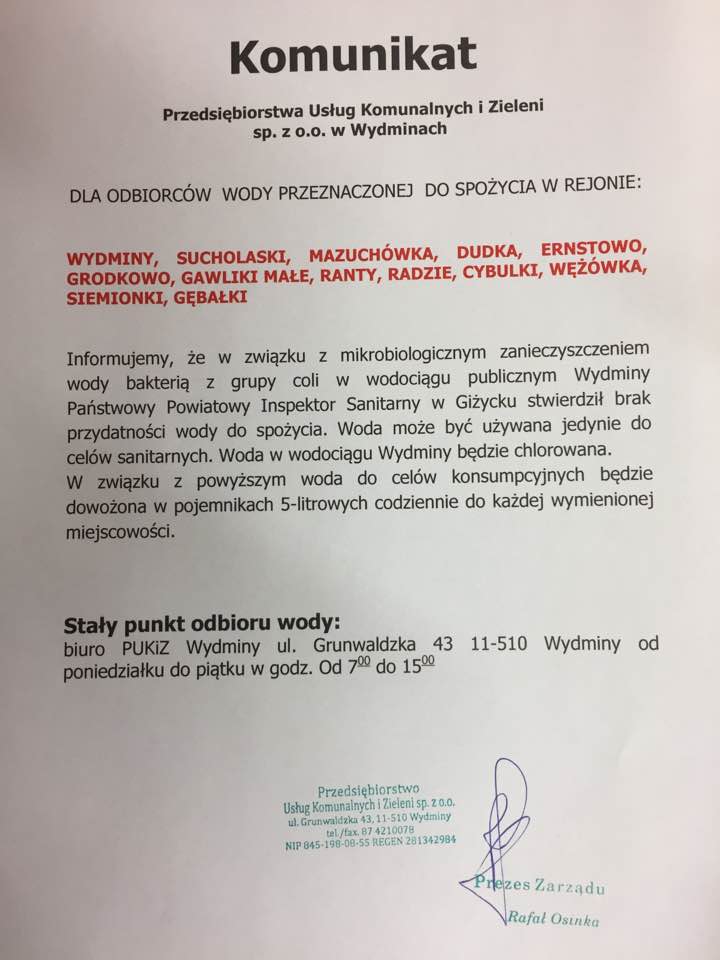 Uwaga!!! Bakteria Z Grupy Coli jest w sieci wodociągowej w Wydminach. Proszę do odwołania nie pić wody. W PUKiZie będzie można uzyskać wodę pitną ok 3 litrów na osobę dziennie.