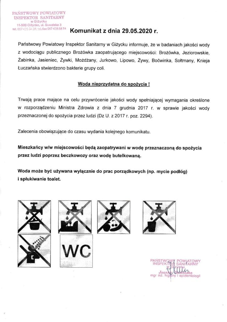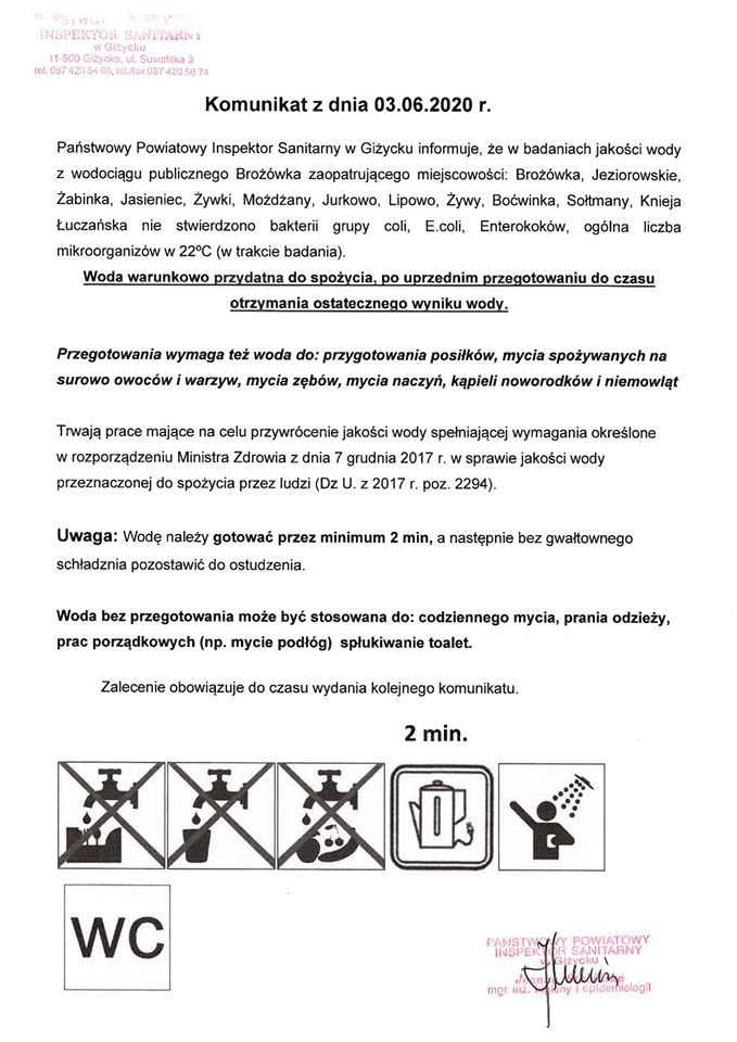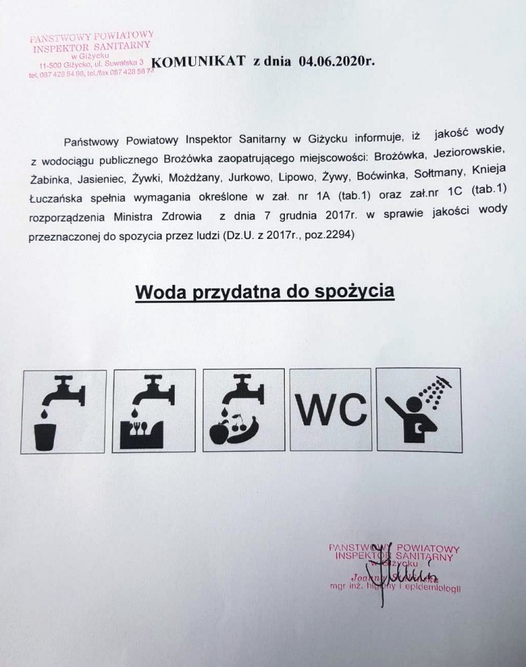 Niestety musimy pić tą wodę bo wójt dał ciała i nie potrafi dostarczyć wody dla mieszkańców starsi ludzie nie są w stanie przejść kilka kilometrów do miejsca dostawy wody i dźwigać ją spowrotem do moich sąsiadów wójt powiedział że jak nie pasuje to niech sobie w plecak naleją i będzie wygodniej a wodę zatruli Agromazury podczas podłączania we wsi Brożówka