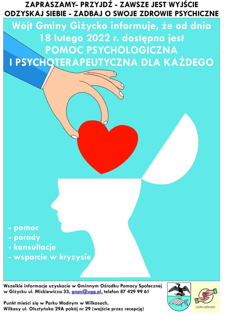 Gminny Ośrodek Pomocy Społecznej informuje o możliwości bezpłatnego skorzystania z pomocy psychologicznej i psychoterapeutycznej. Wsparcie jest skierowane do każdego mieszkańca Gminy Giżycko.