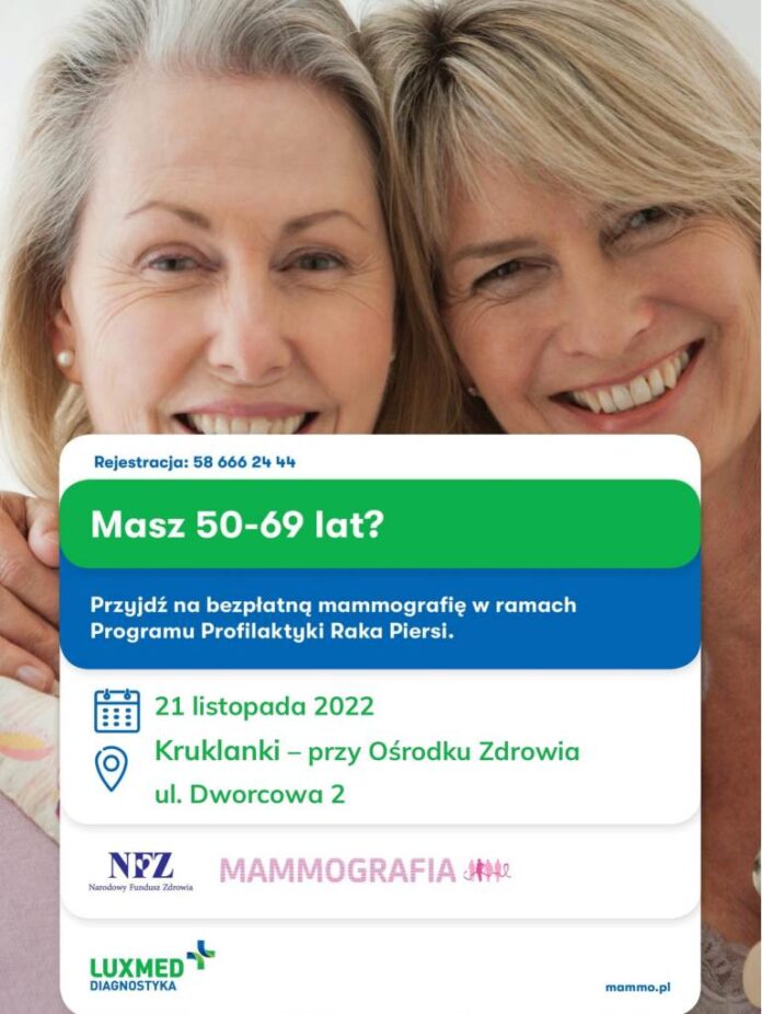 Zapraszamy do mobilnej pracowni mammograficznej: Kruklanki – 21 listopada w godzinach od 14.00 do 16.00 przy Ośrodku Zdrowia, ul. Dworcowa 2