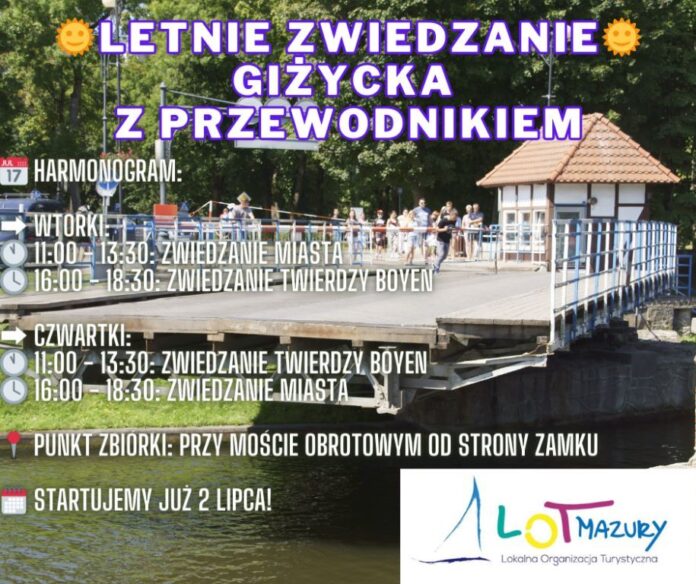 W lipcu i sierpniu zapraszamy do udziału w „Letnim Zwiedzaniu Giżycka z przewodnikiem”! Organizowane przez Lokalną Organizację Turystyczną „Mazury” wycieczki, prowadzone przez licencjonowanych przewodników, oferują niezapomniane wrażenia i głębokie zanurzenie w historii tego malowniczego miasta.