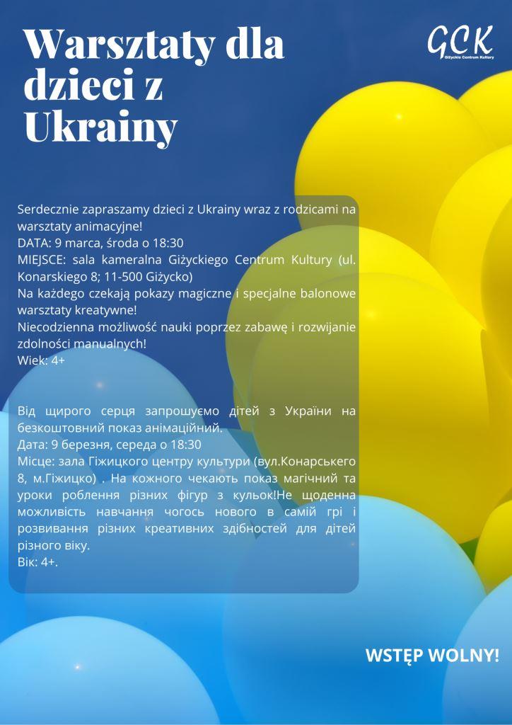 Giżyckie Centrum Kultury wraz z zaprzyjaźnionymi animatorami kultury serdecznie zaprasza dzieci z Ukrainy wraz z rodzicami na bezpłatne zajęcia!
