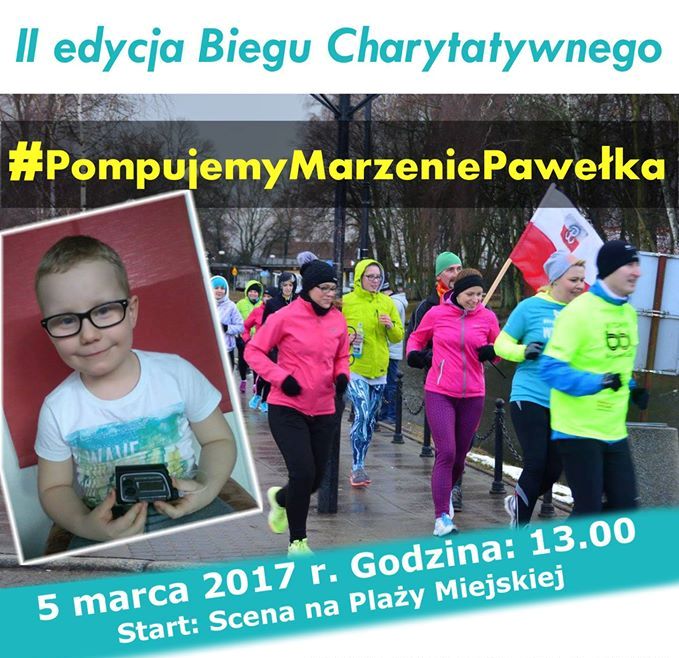 Pobiegnijmy, i tak jak przed rokiem pieniądze zbieraliśmy do specjalnej sztafety-skarbonki dla Sebastiana, tak w tym roku będzie to imitacja wielkiej POMPY-SKARBONKI, dokładnie takiej jaką codziennie nosi przy sobie Pawełek. Podarujmy radość, pobiegnijmy razem dla spełnienia marzeń Pawełka, bo razem możemy #PompowaćMarzenia i dzięki zebranym funduszom wysłać Pawła na turnus rehabilitacyjny! Pawełek biegniemy dla Ciebie 5. marca!