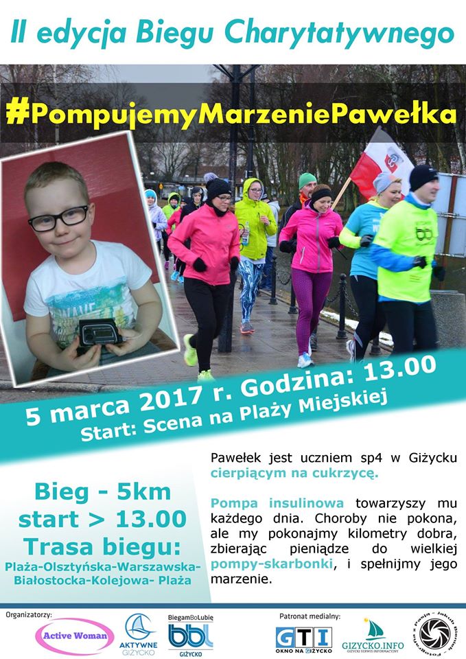 Czas na II edycję Biegu Charytatywnego, z nowym bohaterem, którym jest 8-letni mieszkaniec Giżycka – Pawełek. Ten niesamowicie pogodny chłopak, cierpi jednak na cukrzycę. Jego życie nie wygląda tak samo jak jego rówieśników. Ograniczony wysiłek fizyczny, kontrola cukru, a każdego dnia jego życia będzie towarzyszyła mu pompa insulinowa. Pawełek nie wygra walki z cukrzycą, ale my możemy wygrać dla niego!