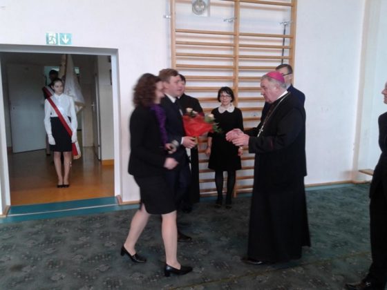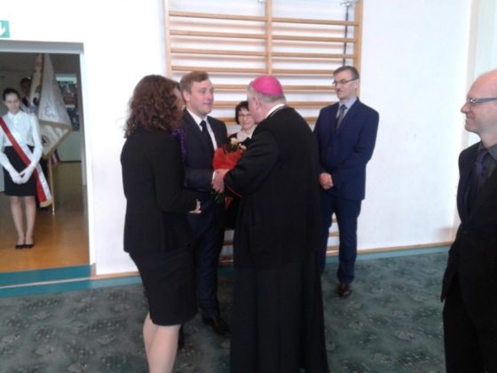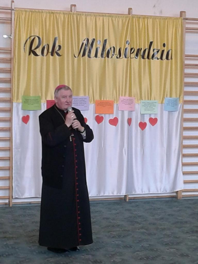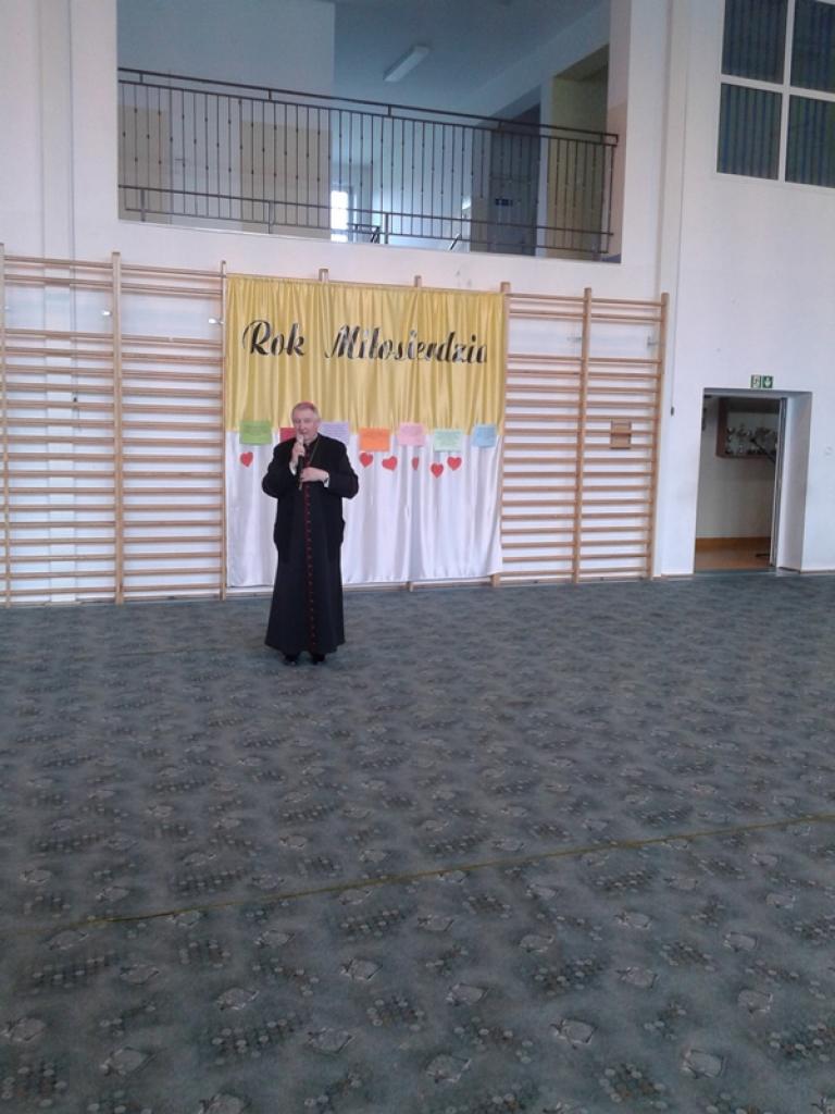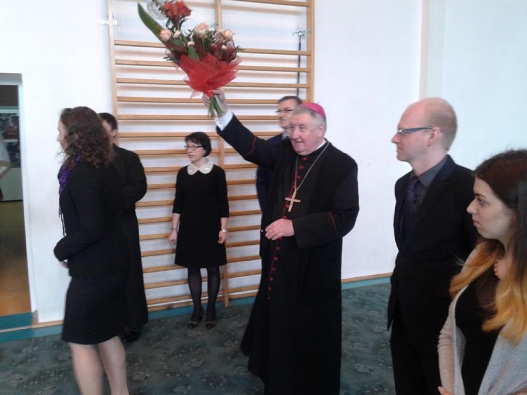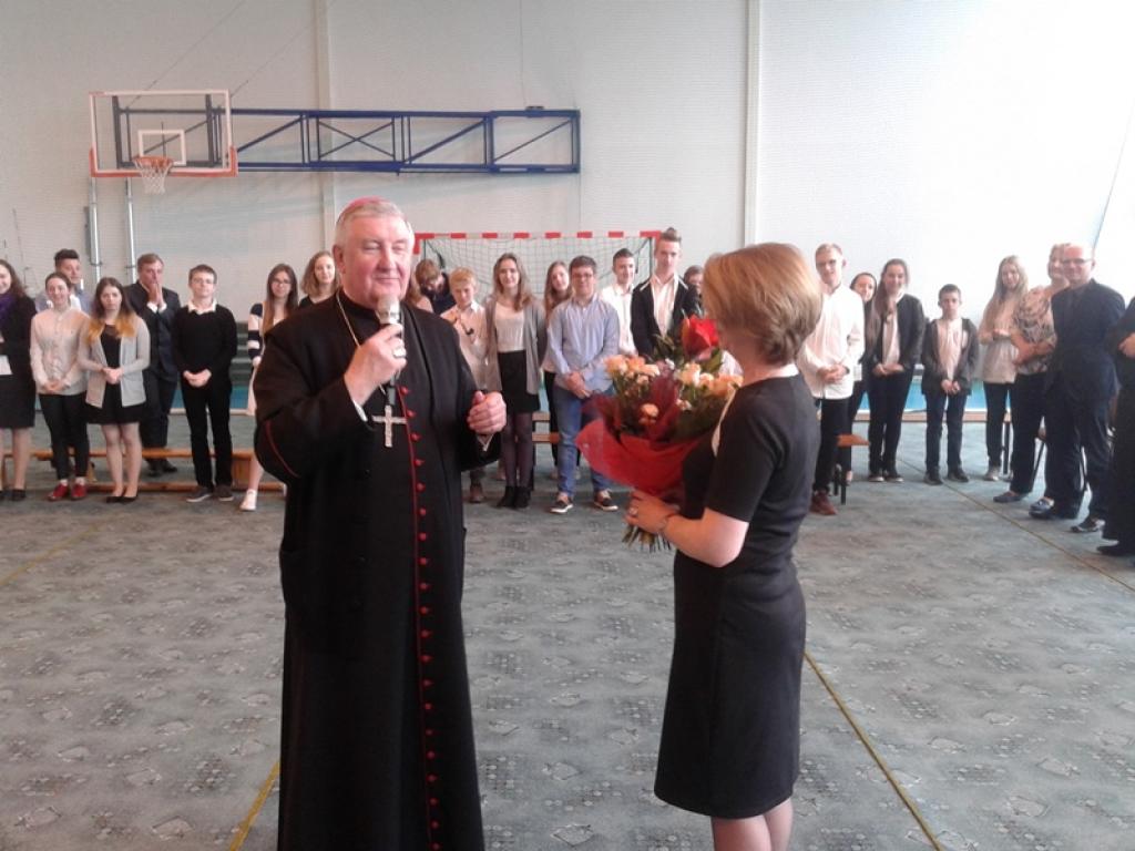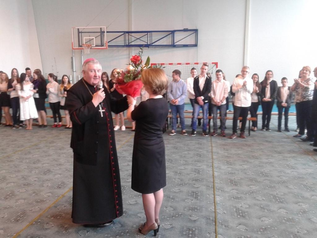 Dnia 26 kwietnia 2016r. naszą szkołę odwiedził Ksiądz Biskup Romuald Kamiński. Z tej okazji odbył się uroczysty apel, na który grupa uczniów z klasy III B z pomocą Ali Wołoszyn z III C i Ali Grodzickiej z IIA przygotowała montaż słowno-muzyczny. Poruszał on problemy współczesnego świata : pośpiech, zabieganie, brak czasu dla drugiego człowieka, obojętność na bezinteresowną pomoc, zbytnie zaabsorbowanie pracą i karierą. Na koniec Ksiądz Biskup podsumował nasze rozważania kierując do nas słowa pobudzające jeszcze głębiej do refleksji i udzielił błogosławieństwa całej społeczności szkolnej.