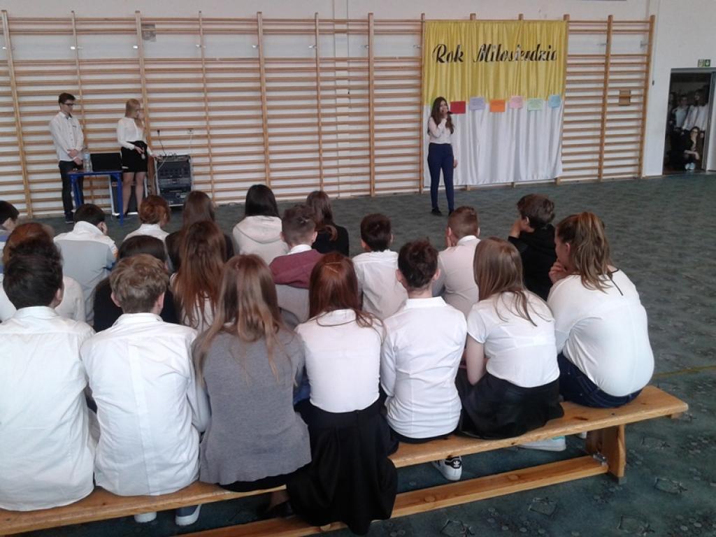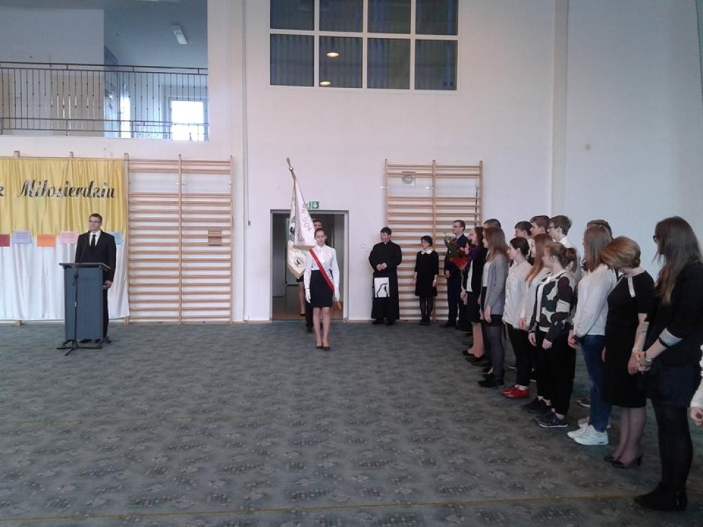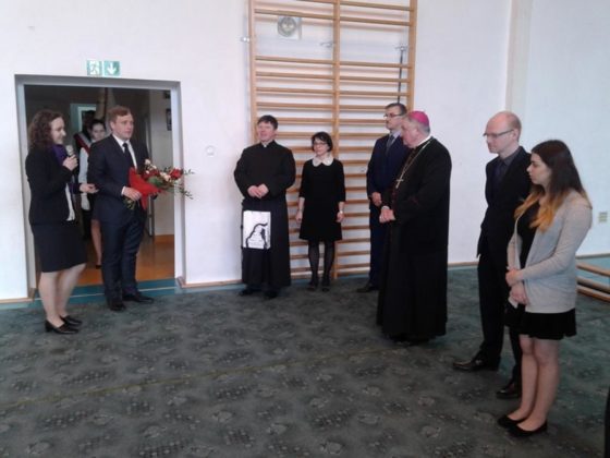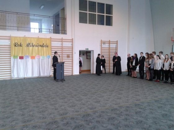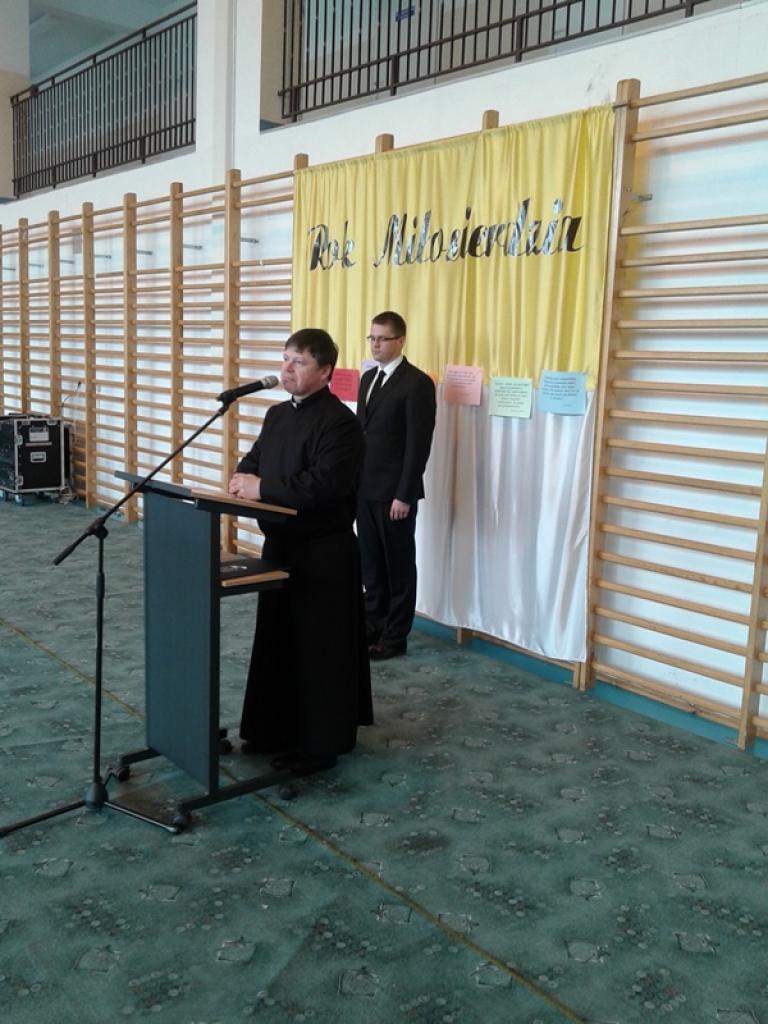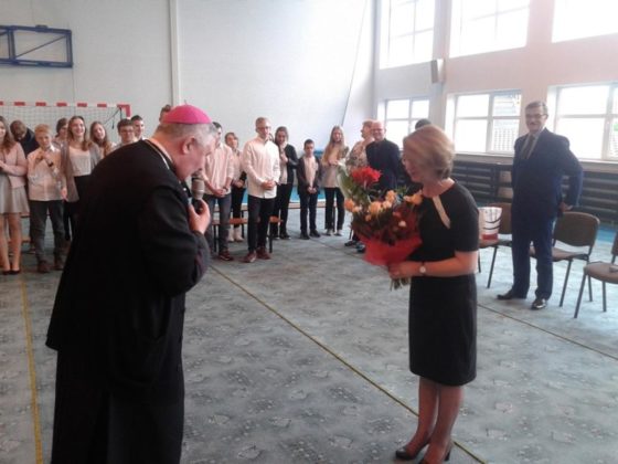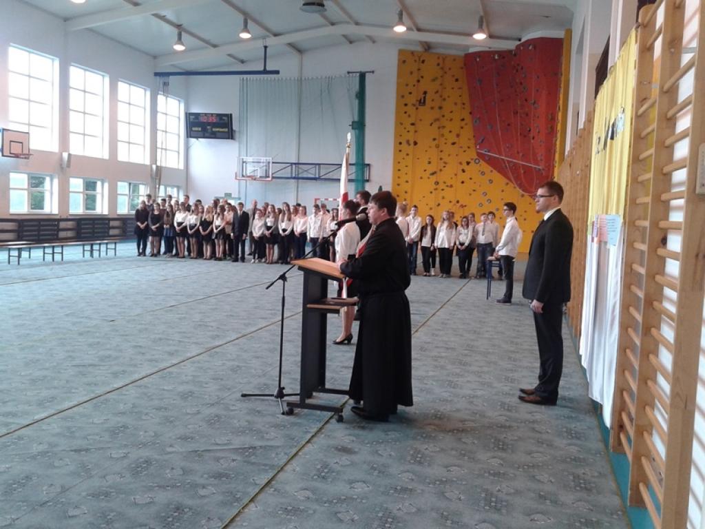 Dnia 26 kwietnia 2016r. naszą szkołę odwiedził Ksiądz Biskup Romuald Kamiński. Z tej okazji odbył się uroczysty apel, na który grupa uczniów z klasy III B z pomocą Ali Wołoszyn z III C i Ali Grodzickiej z IIA przygotowała montaż słowno-muzyczny. Poruszał on problemy współczesnego świata : pośpiech, zabieganie, brak czasu dla drugiego człowieka, obojętność na bezinteresowną pomoc, zbytnie zaabsorbowanie pracą i karierą. Na koniec Ksiądz Biskup podsumował nasze rozważania kierując do nas słowa pobudzające jeszcze głębiej do refleksji i udzielił błogosławieństwa całej społeczności szkolnej.