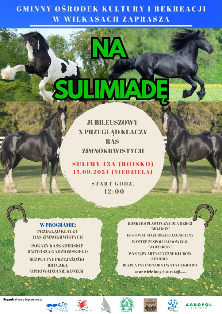 Gminny Ośrodek Kultury i Rekreacji w Wilkasach zaprasza 15 września (niedziela) na Sulimiadę - Jubileuszowy X Przegląd Klaczy Ras Zimnokrwistych. Wydarzenie odbędzie się w...