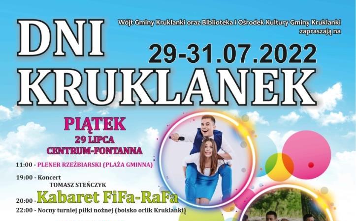 Wójt Gminy Kruklanki oraz Biblioteka i Ośrodek Kultury Gminy Kruklanki zapraszają na Dni Kruklanek.Program wydarzenia na plakacie.