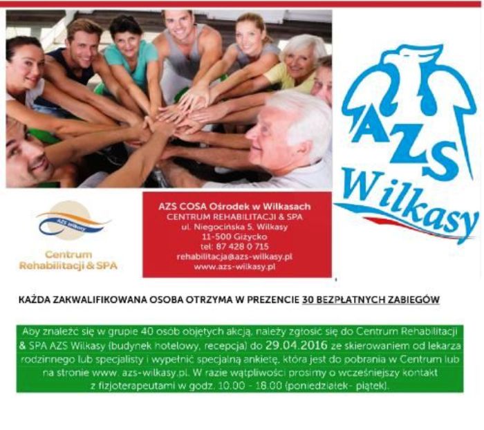 Centrum Rehabilitacji przy Ośrodku AZS COSA w Wilkasach kontynuując akcję charytatywną “POMOCNA DŁOŃ” zaprasza mieszkańców Giżycka na bezpłatne zabiegi fizjoterapeutyczne. 9-20 maja 2016 r.