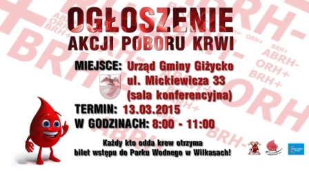 13 marca w Urzędzie Gminy Giżycko przy ul. Mickiewicza 33 odbędzie się akcja poboru krwi. Osoby,które zdecydują się oddać krew dostaną bilet wstępu do...