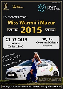 Mieszkanki Warmii i Mazur, w sobotę 21.03.2015r w Giżyckim Centrum Kultury, odbędzie się casting do Konkursu Miss Warmii i Mazury 2015 oraz Miss Nastolatek...