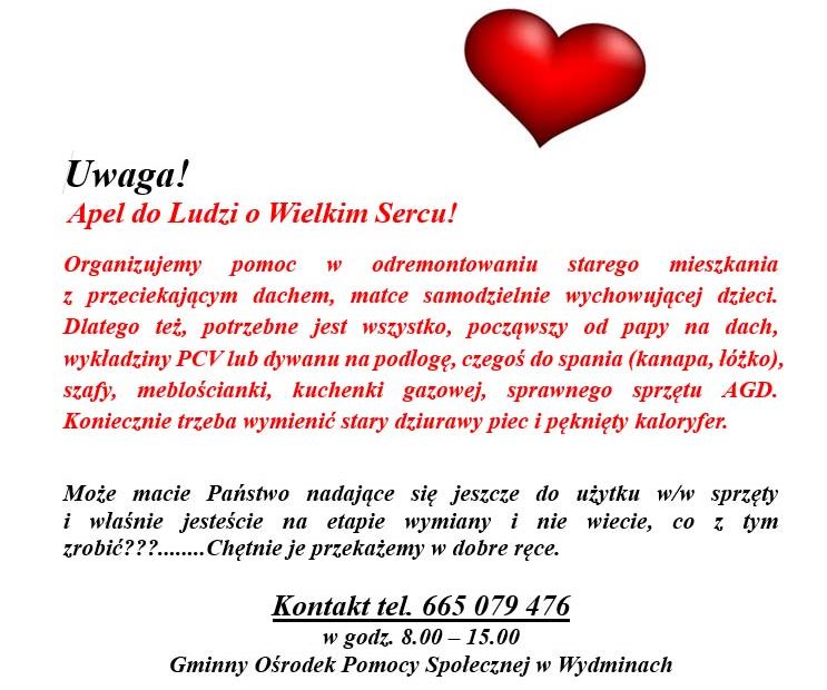 Gminny Ośrodek Pomocy Społecznej w Wydminach opublikował apel z prośbą o pomoc w remoncie starego mieszkania, w którym mieszka matka samotnie wychowująca dzieci. Poniżej treść...