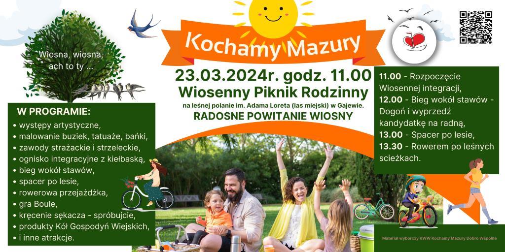 KWW Kochamy Mazury Dobro Wspólne zaprasza 23 marca o godzinie 11:00 do Lasu Miejskiego w Gajewie na "Wiosenny Piknik Rodzinny. Radosne Powitanie Wiosny". W programie...