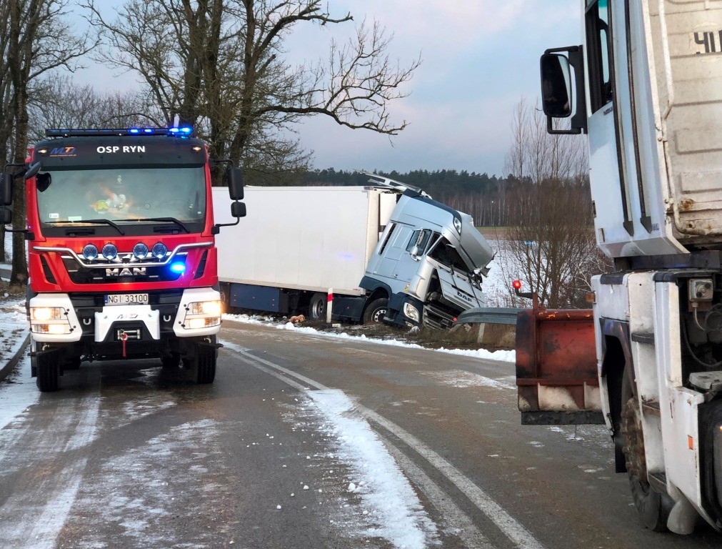 W środę, 8 stycznia, w godzinach porannych strażacy z Giżycka interweniowali w związku z wypadkiem drogowym z udziałem ciągnika siodłowego z naczepą. Do zdarzenia doszło na drodze wojewódzkiej nr 642 w pobliżu miejscowości Zielony Lasek w gminie Ryn.