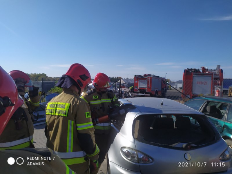 Strażacy na terenie Auto-Złom w Giżycku doskonalili techniki operowania narzędziami hydraulicznymi.