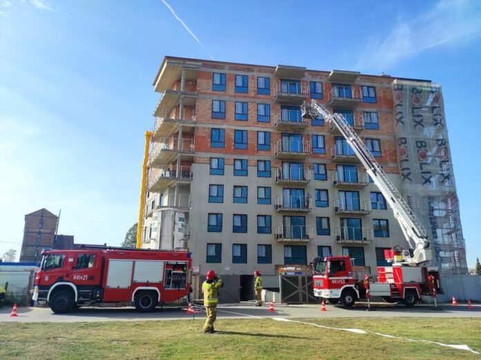 Podczas ćwiczeń sprawdzono możliwości rozstawienia podnośnika hydraulicznego względem nowo budowanego budynku w Giżycku.