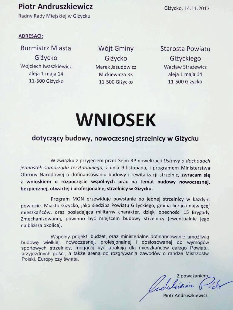 Od stycznia 2018 r. Ministerstwo Obrony Narodowej wprowadzi program związany z dofinansowaniem budowy i rewitalizacji strzelnic. Radny Rady Miejskiej w Giżycku Piotr Andruszkiewicz złożył wniosek do władz miasta, gminy i powiatu dotyczący budowy nowoczesnej strzelnicy w Giżycku. Według radnego Andruszkiewicza taki obiekt stanowiłby sporą atrakcję nie tylko dla mieszkańców naszego powiatu, ale także przyjezdnych gości. Radny argumentuje swój wniosek również tym, że Giżycko jako miejsce stacjonowania 15 Giżyckiej Brygady Zmechanizowanej ma charakter militarny.