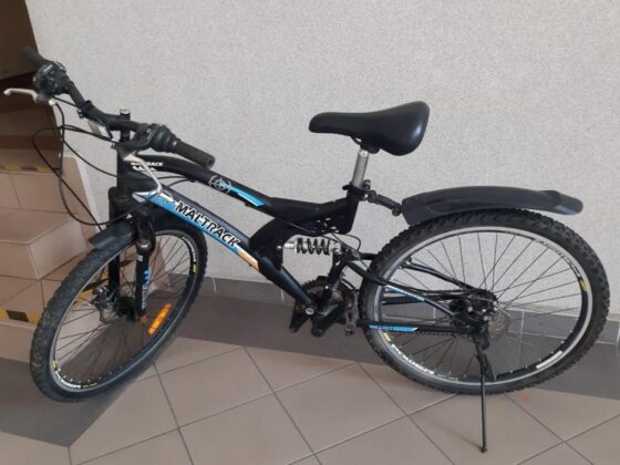 - – pierwszy rower jest koloru czarnego, posiada niebieskie elementy graficzne oraz napis „MALTRACK”,