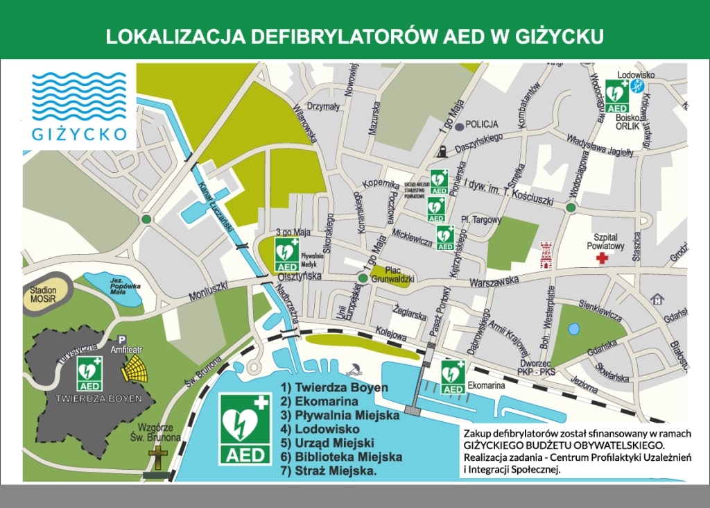 31 maja br. w Giżycku zostały rozmieszone defibrylatory AED – urządzenia, które w przypadku nagłego zatrzymania akcji serca, mogą uratować życie. Zakup urządzeń AED został sfinansowany w ramach Giżyckiego Budżetu Obywatelskiego, a realizacją zadania zajmowała się Ewa Ostrowska – dyrektor Centrum Profilaktyki Uzależnień i Integracji Społecznej we współpracy z II Zastępcą Burmistrza Giżycka Cezarym Piórkowskim.