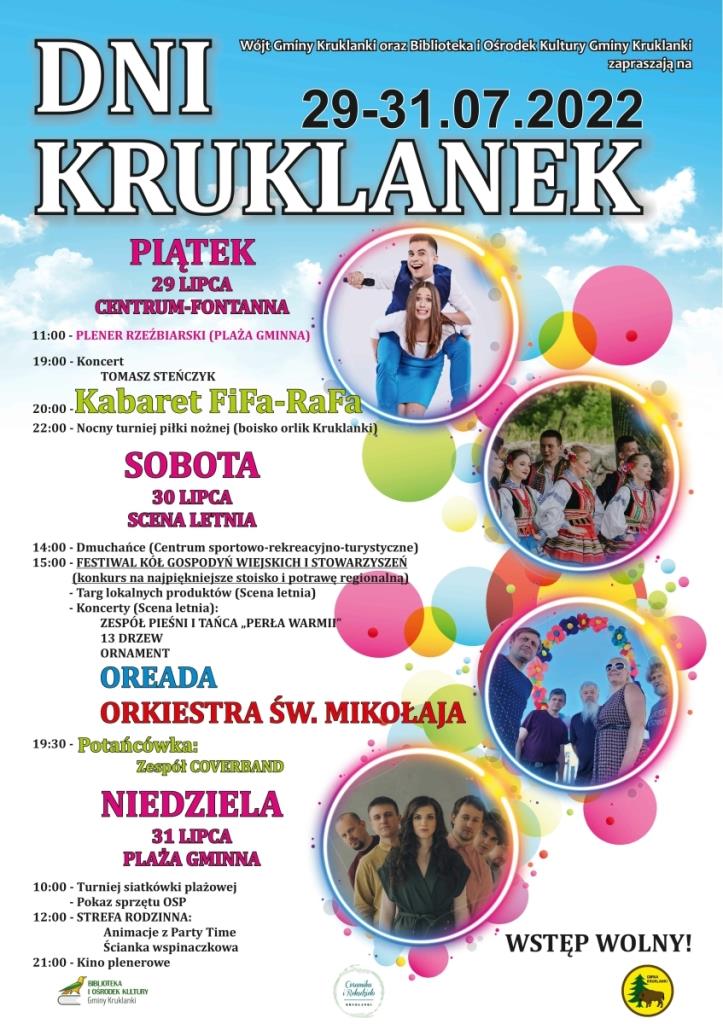 Dni Kruklanek 2022 (PROGRAM) 19 lipca 20221Wójt Gminy Kruklanki oraz Biblioteka i Ośrodek Kultury Gminy Kruklanki zapraszają na Dni Kruklanek.Program wydarzenia na plakacie.
