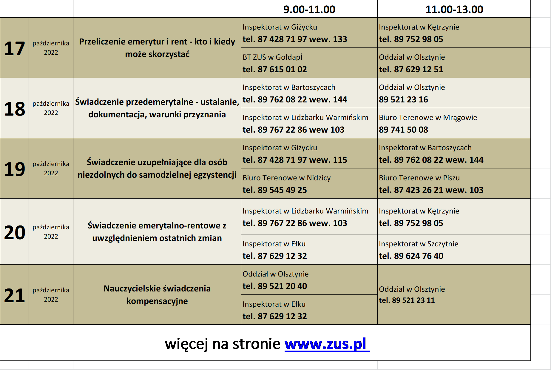Oddział ZUS w Olsztynie w październiku organizuje Dni Seniora, które są doskonałą okazją do uzyskania niezbędnych informacji zarówno z zakresu działalności ZUS ale także zaproszonych instytucji. W ramach zaplanowanych wydarzeń odbędą się dyżury telefoniczne.