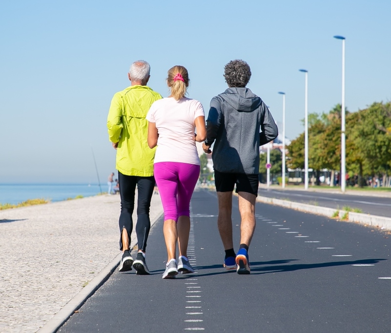 Strona główna Dodatkowe 1000 kroków dziennie zmniejsza ryzyko śmierci Back view of mature joggers in sports clothes running on track