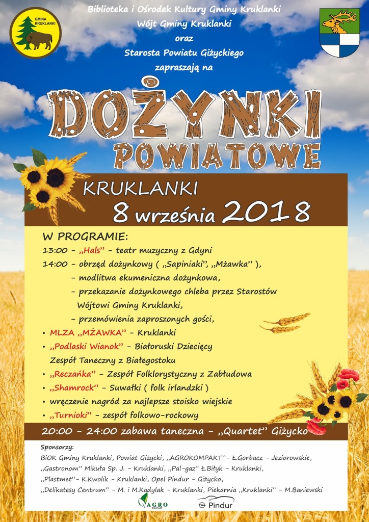 Dożynki Powiatowe 2018 [ZAPOWIEDŹ] 3 września 20180Biblioteka i Ośrodek Kultury Gminy Kruklanki, Wójt Gminy Kruklanki oraz Starosta Powiatu Giżyckiego zapraszają na Dożynki Powiatowe.