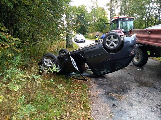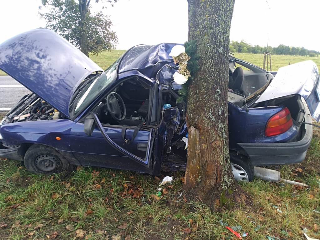 Mieszkanka naszego powiatu chyba miała mało miejsca na tym zakręcie. Ratując się ściągnęło ją na drzewo i taki wynik.