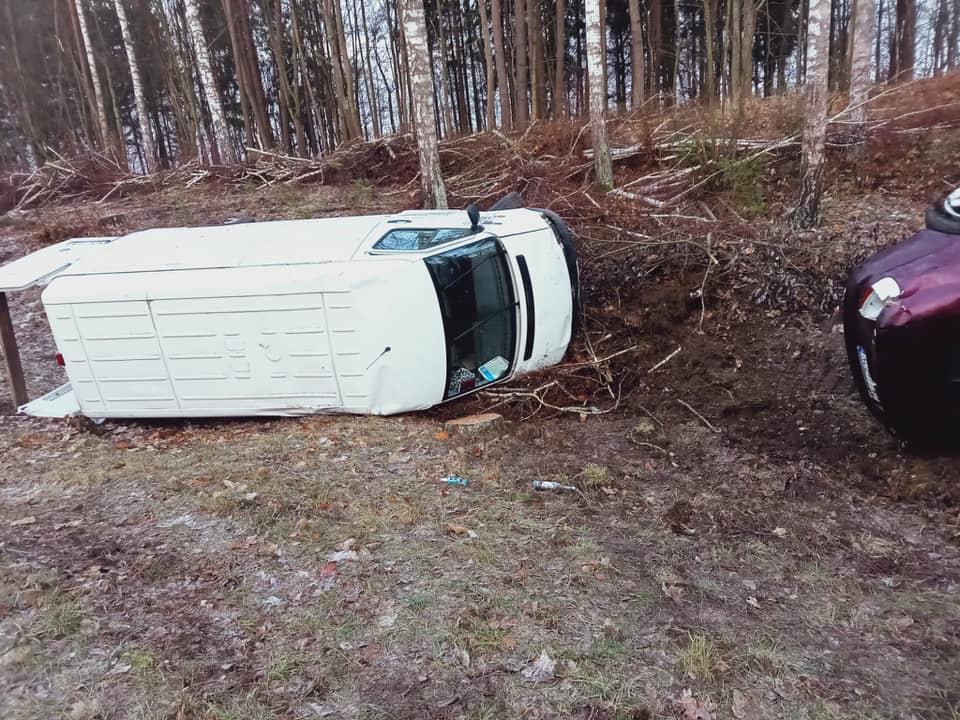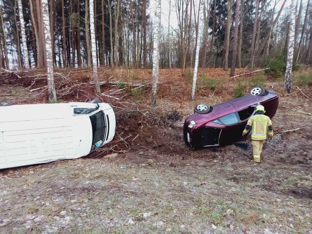Na ostrym zakręcie z drogi wypadły dwa samochody, które przewróciły się na bok. Wskutek zdarzenia jedna osoba została poszkodowana.