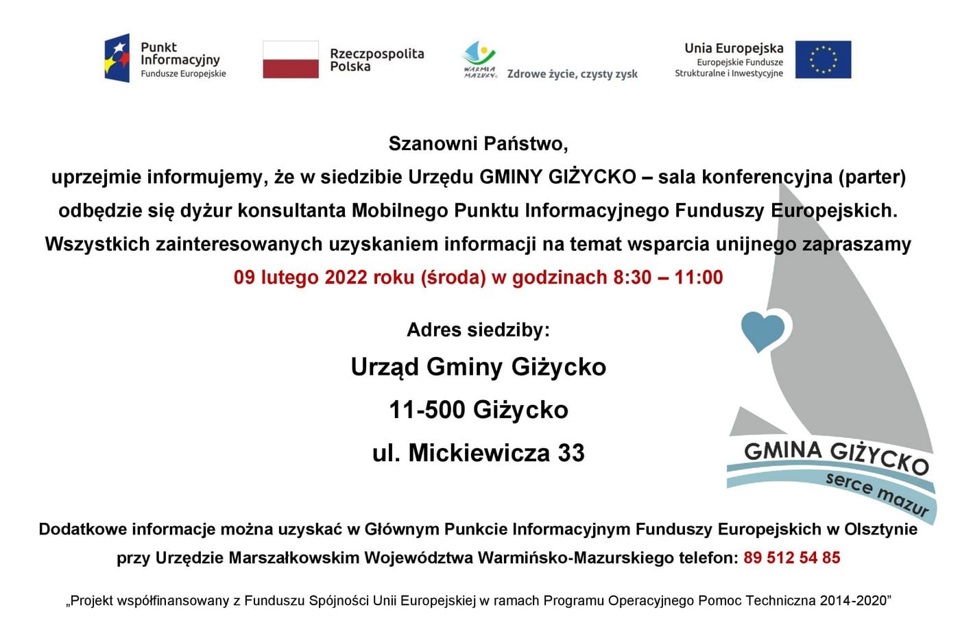 Dyżur konsultanta Mobilnego Punktu Informacyjnego Funduszy Europejskich w Urzędzie Gminy Giżycko 19 stycznia 20220Urząd Gminy Giżycko informuje.