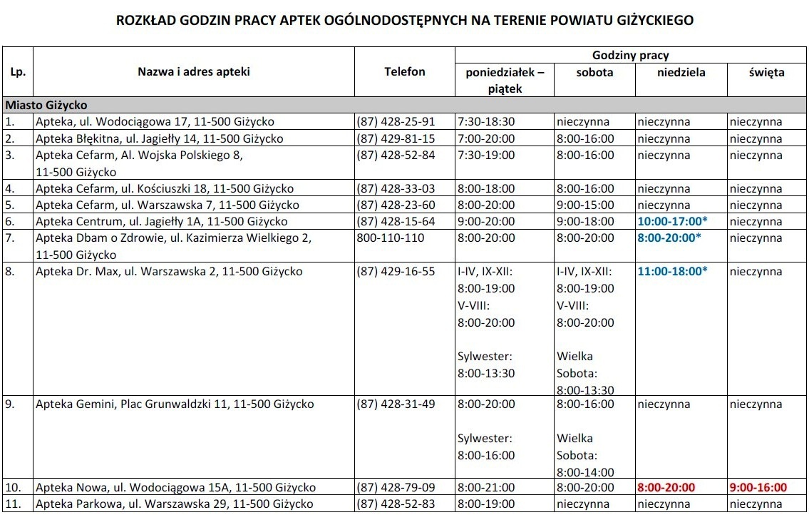 Od dnia 1 stycznia 2026 r. do dnia 31 grudnia 2026 r. dyżury w porze nocnej i dyżury w dni wolne od pracy pełni APTEKA PRZYJAZNA, ul. T. Kościuszki 25A i 25B, 11‑500 Giżycko, według następującego harmonogramu: