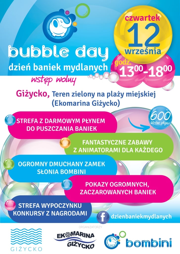 Przed mieszkańcami Giżycka dzień pełen wrażeń. W naszym mieście odbędzie się Bubble Day czyli Dzień Baniek Mydlanych. Impreza organizowana jest w 140 miastach Polski, a jednym z nich będzie właśnie Giżycko. Fantastyczne niespodzianki będą czekać na mieszkańców w najbliższy czwartek 12 września.