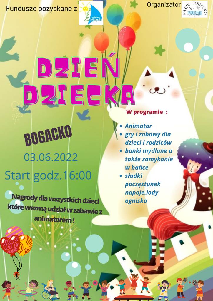 Dzień Dziecka w Bogacku (zapowiedź) 23 maja 20220Stowarzyszenie Nasze Bogacko zaprasza 3 czerwca na Dzień Dziecka do Bogacka. Szczegóły wydarzenia na plakacie.