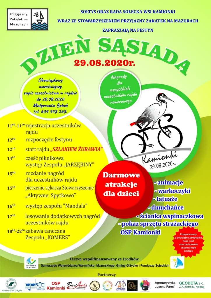 Stowarzyszenie „PRZYJAZNY ZAKĄTEK NA MAZURACH” oraz Sołtys wraz z Radą Sołecką wsi Kamionki, zapraszają na festyn pt. „DZIEŃ SĄSIADA” połączony z rajdem rowerowym „SZLAKIEM ŻURAWIA”. Gwarantujemy dużo ciekawych atrakcji i super zabawę.