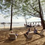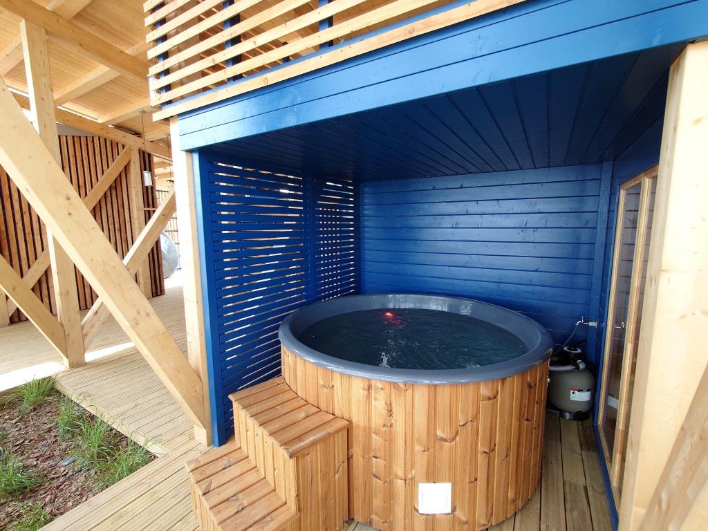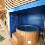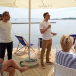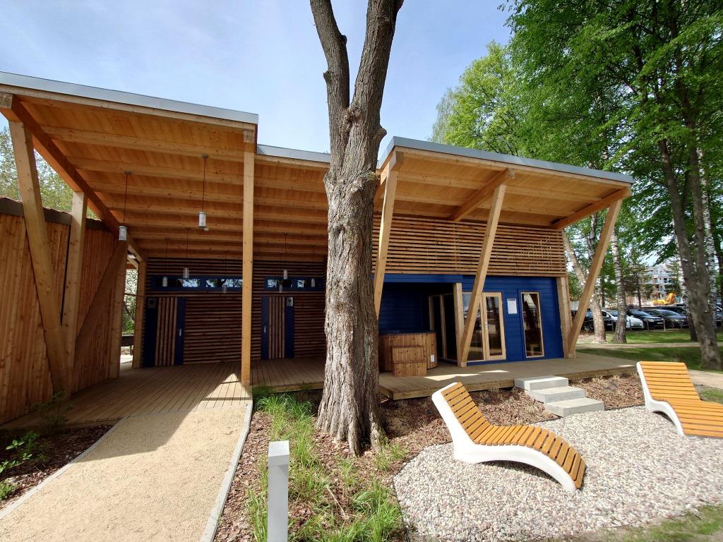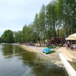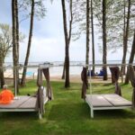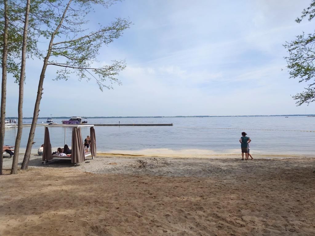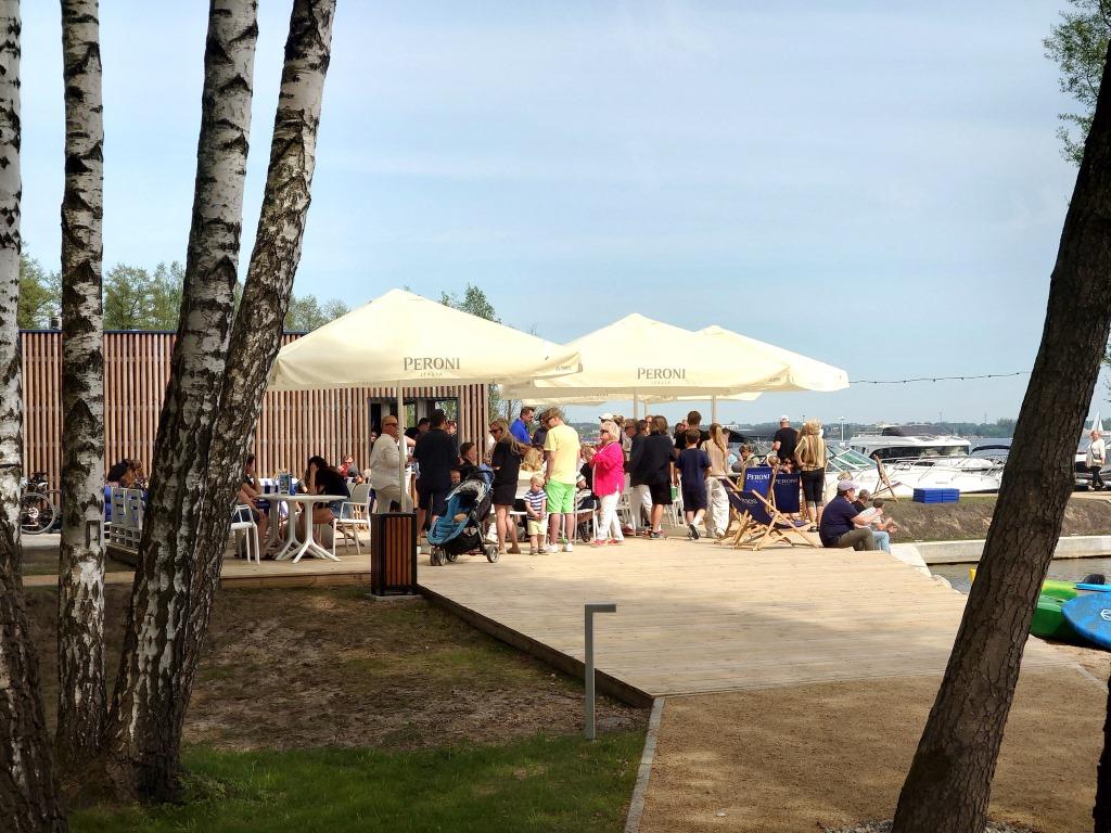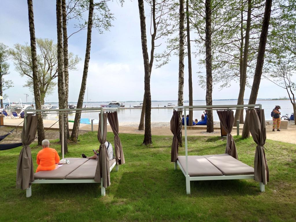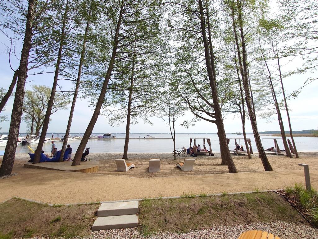 Z Eko Plaży można swobodnie przejść do Beach Baru, z tarasem nad jeziorem i platformami wypoczynkowymi z widokiem na szlak wodny.