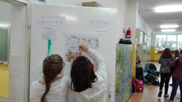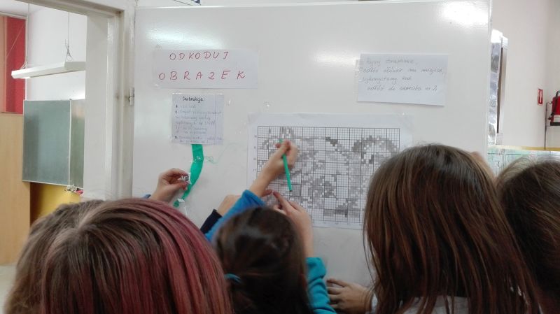 W starszych klasach programowanie bez komputera: odkodowywanie obrazków, znajdywanie drogi wg podanych współrzędnych z wykorzystaniem kart pracy odbyło się pod kierunkiem matematyczek: pani Joanny Danielczyk, pani Doroty Karpowicz i pani Janiny Morskiej.