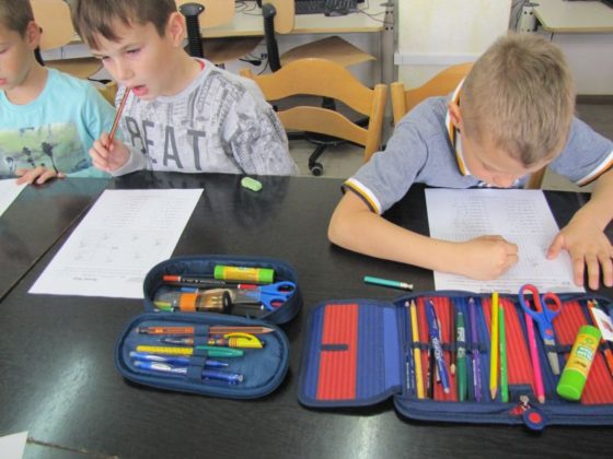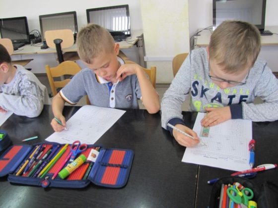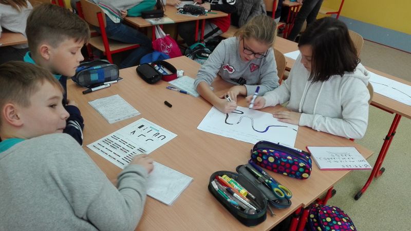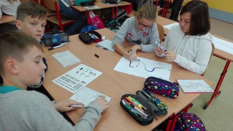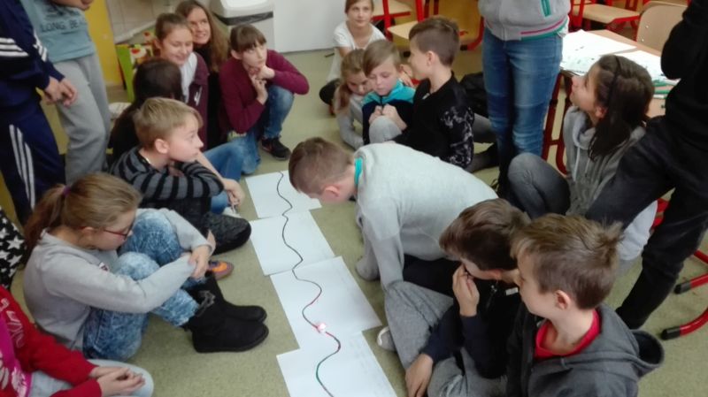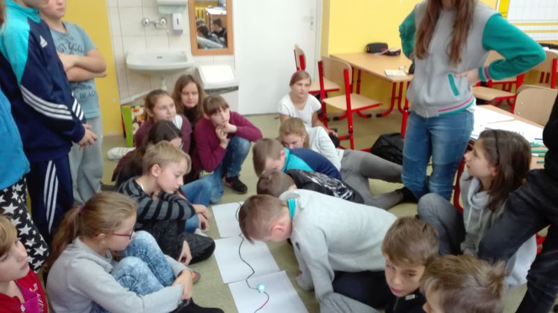 Uczniowie klasy Vd powtarzali własności liczb naturalnych z robotem Ozobotem. Rysowali trasę robota korzystając z kodów graficznych. Każda grupa rysowała swój „kawałek” trasy, po czym utworzono jedną drogę dla robota. Dzieci musiały odpowiedzieć na pytanie w czasie jazdy robota przez określony odcinek drogi. Pilnowały, żeby nie dać się wyprzedzić robotowi.