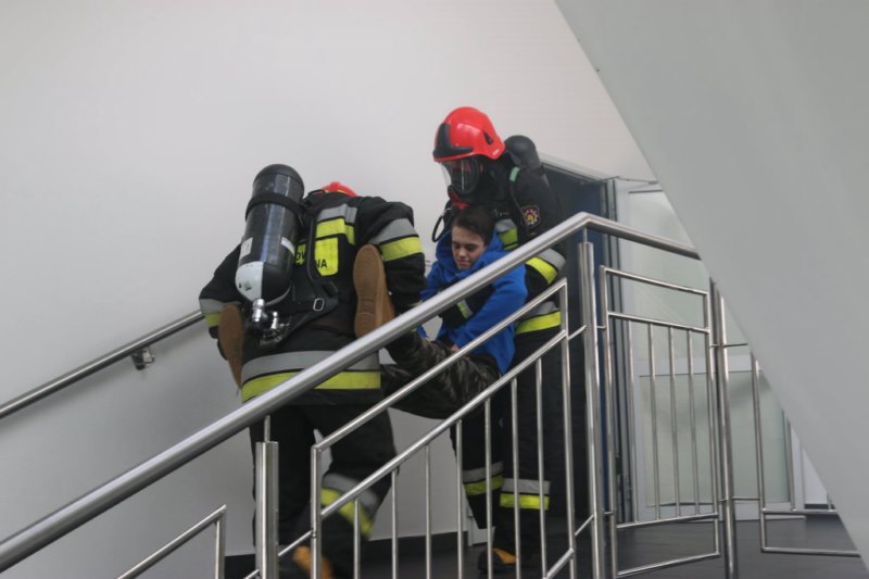 Scenariusz ćwiczeń przewidywał, że w wyniku zwarcia instalacji elektrycznej doszło do pożaru w pomieszczeniach biurowych na parterze. Pracownicy i osoby znajdujące się wewnątrz obiektu zostali ewakuowani na zewnątrz. Na drugim pietrze pozostały dwie osoby, którym drogę ewakuacyjna odciął gęsty dym. Na miejsce zostały zadysponowane: 2 zastępy gaśnicze JRG, zastęp WSP Giżycko oraz straż straż miejska. Działania strażaków polegały na odnalezieniu poszkodowanych, ewakuacji poszkodowanych, udzieleniu pomocy medycznej oraz prowadzeniu działań gaśniczych.