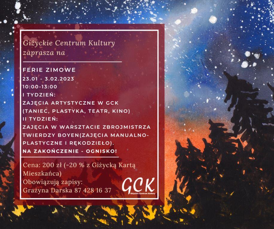 Już niedługo ferie zimowe! Giżyckie Centrum Kultury zaprasza od 23 stycznia do 3 lutego 2023, w godzinach 10:00-13:00 wszystkie dzieci w wieku od 8 do 12 lat.