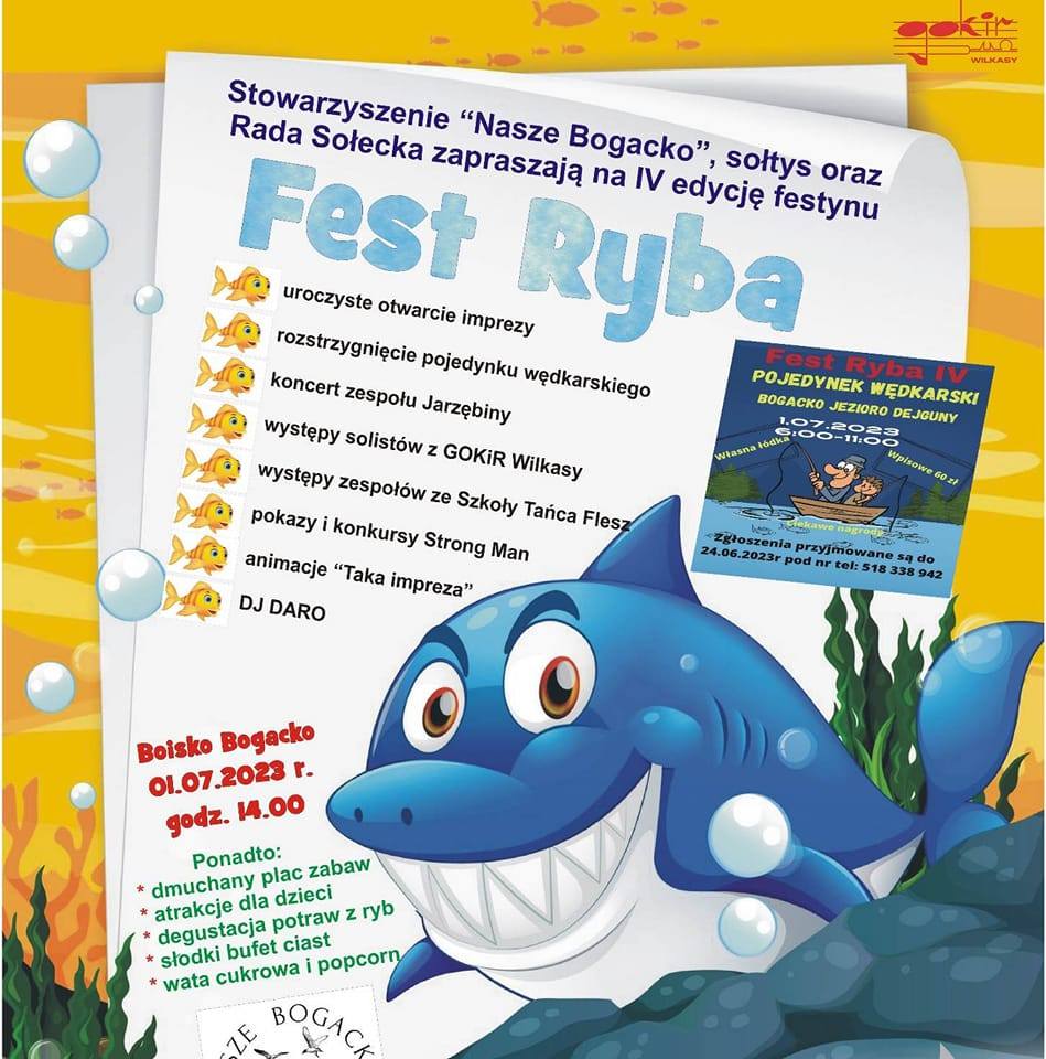 Stowarzyszenie „Nasze Bogacko”, sołtys oraz Rada Sołecka zapraszają 1 lipca do Bogacka na IV edycję festynu „Fest Ryba”.