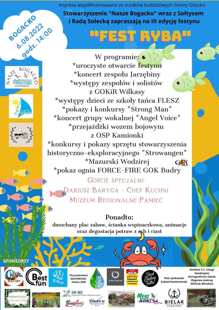 Stowarzyszenie Nasze Bogacko wraz z Sołtysem i Radą Sołecką zapraszają na III edycję festynu „Fest Ryba”.
